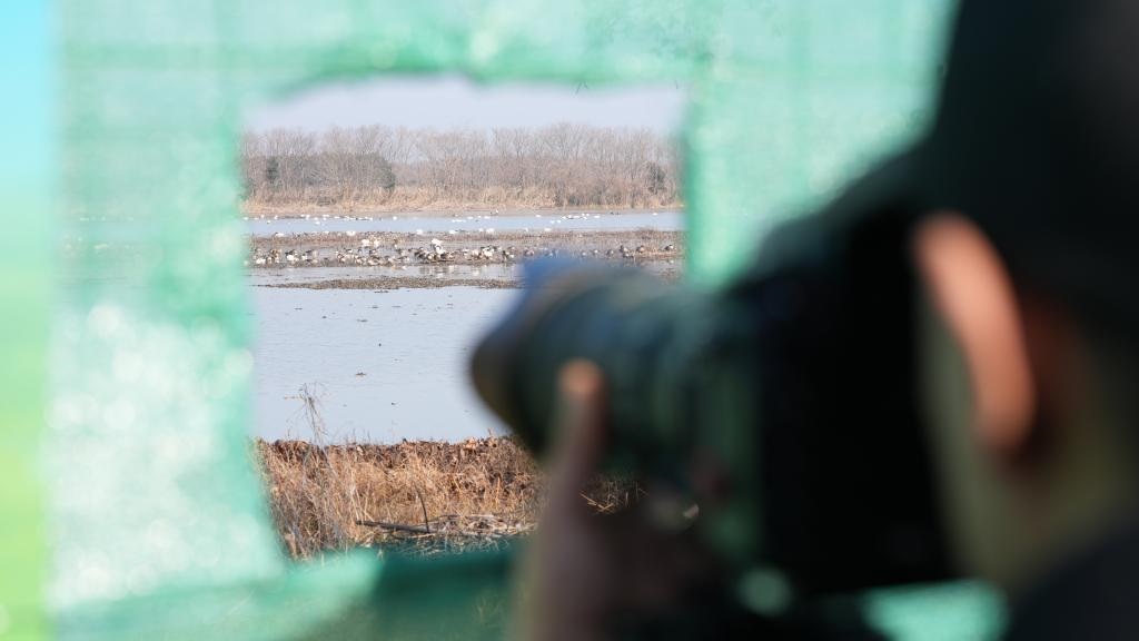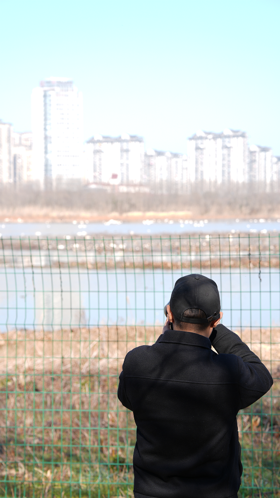 2026年1月7日,饶颐在安徽省池州市平天湖风景区拍摄候鸟。新华社记者 胡锐 摄