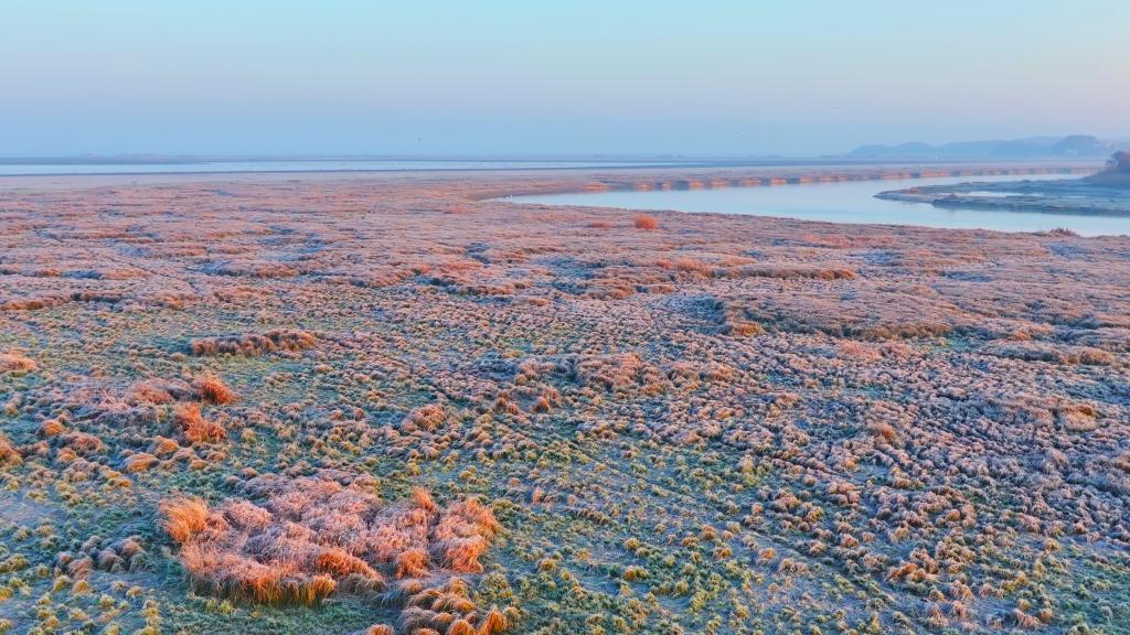 2025年12月26日,安徽升金湖国家级自然保护区,晨雾中覆着薄霜的草甸与静谧的河道相连。饶颐 摄
