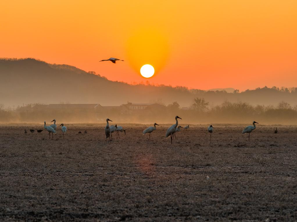 2026年1月8日,安徽升金湖国家级自然保护区,朝阳为大地铺就暖橙底色,白鹤群在薄雾笼罩的湿地上栖息、翩飞。饶颐 摄