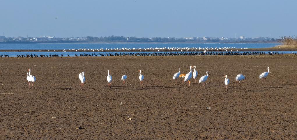 2025年11月25日,安徽升金湖国家级自然保护区,白鹤与鸬鹚、白琵鹭在滩涂与湖畔悠然栖息。饶颐 摄