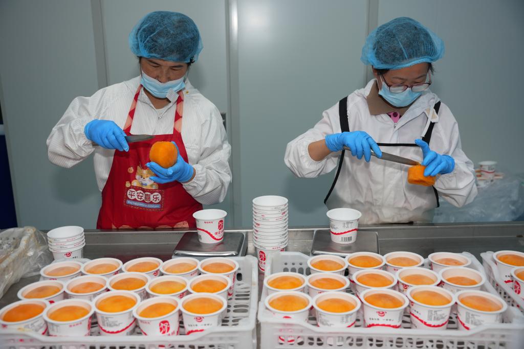 “往年便宜,我家400棵柿子树都租给了别人。如今自己种,年产4万斤,每月打工收入还有3000多元。”60岁的削皮工韩志花是中独乐村村民,工厂提供培训和岗位,让她和一批村民实现家门口就业增收。