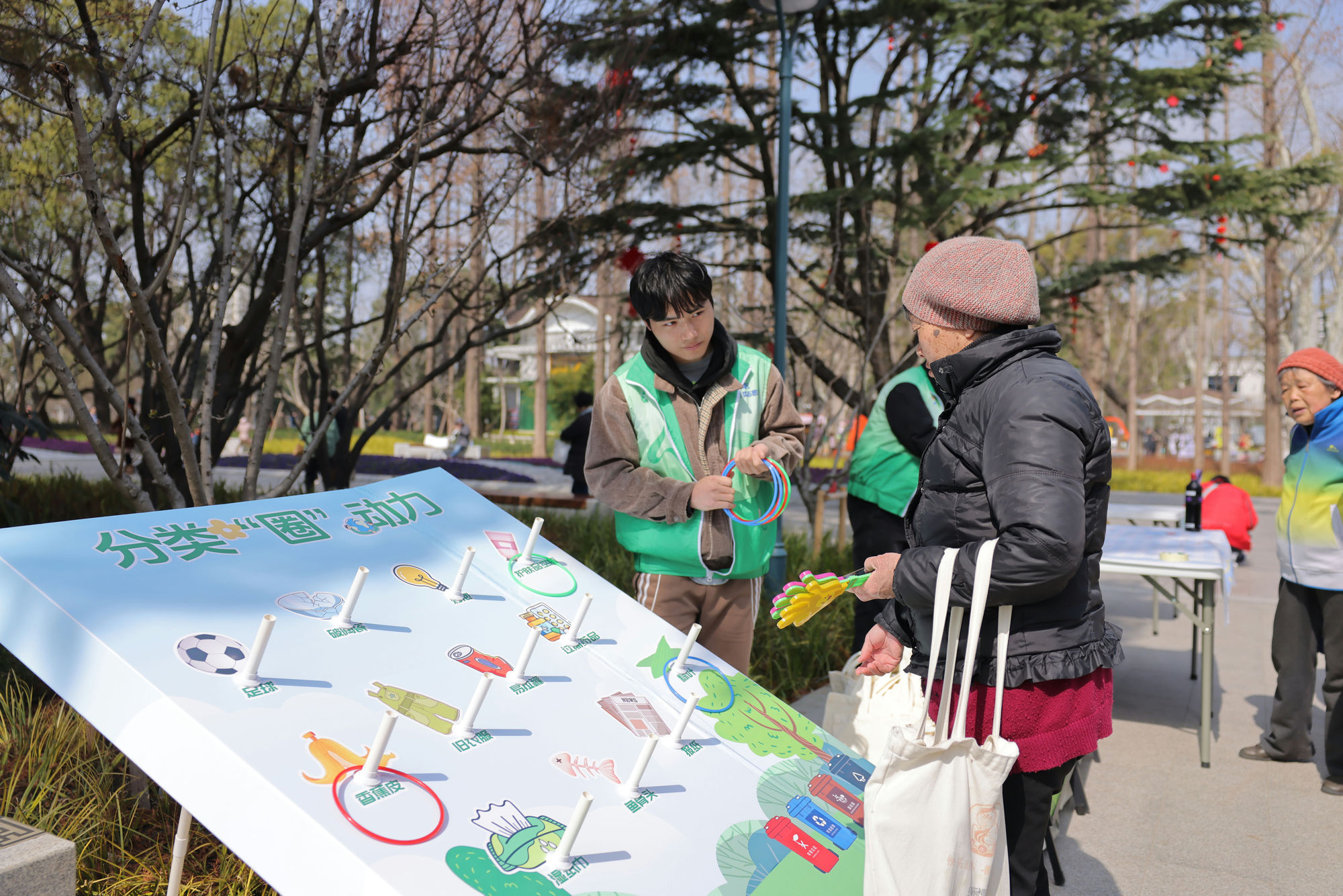 活动现场,30组亲子家庭进行闲置物品爱心义卖,所得金额全部捐入中国绿化基金会,统一认养了园内的6棵广玉兰、6棵白玉兰,并现场挂上定制认养牌。同时,志愿者们还通过设置咨询台、发放宣传册、游戏互动等方式,向市民游客开展垃圾分类宣传,提供绿植养护咨询,普及绿化法规知识。