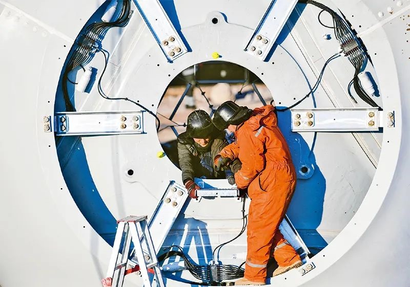 河北承德丰宁风光氢储100万千瓦风光项目是国家“十四五”规划的大型清洁能源基地——冀北清洁能源基地的标志性工程。项目建成后,预计每年可生产绿电18亿千瓦时,减少二氧化碳排放约140万吨。图为2024年1月12日,该项目的工人在安装风机轮毂配件。 新华社发 王立群/摄