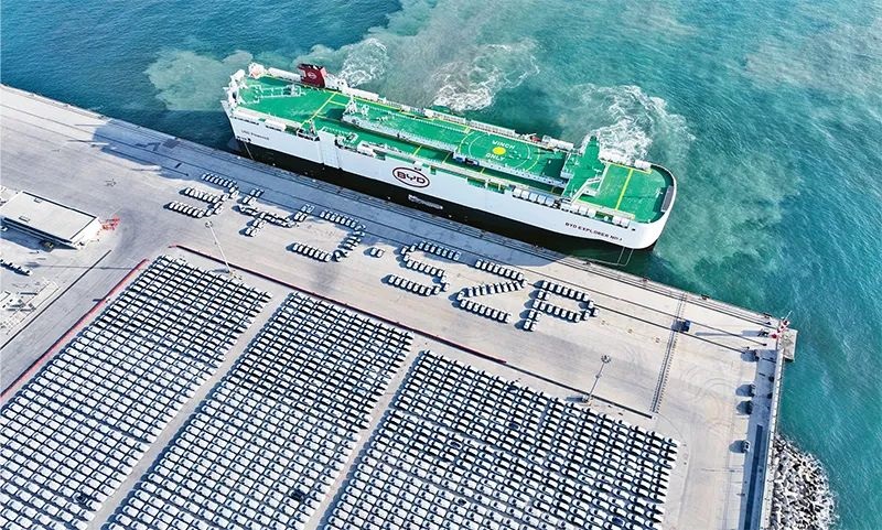 2023年,我国电动载人汽车、锂离子蓄电池和太阳能电池为代表的“新三样”产品合计出口首次突破万亿元大关,展现了中国制造的新优势。图为2024年1月14日,比亚迪“开拓者1号”(“BYD EXPLORER NO.1”)滚装船抵达深圳港小漠国际物流港。 新华社发