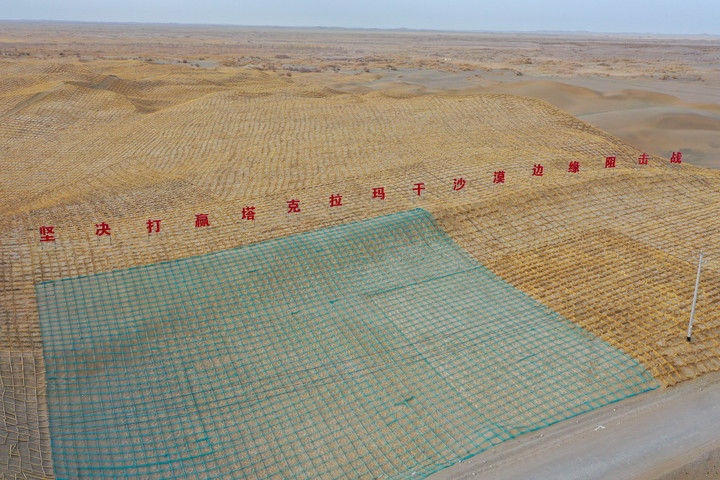 这是2025年4月8日在新疆和田地区民丰县拍摄的防沙治沙试验站周边的芦苇方格沙障(无人机照片)。今年以来,新疆持续巩固拓展塔克拉玛干沙漠锁边成果,截至10月底,21个重点县市在去年锁边“合龙”基础上新增植绿扩边面积936.17万亩,锁边绿色防护带宽度增加110米至7500米,水、电、路等配套项目也持续跟进。这条“绿围脖”正越织越厚实。