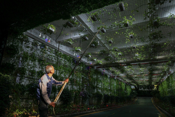 2025年4月2日,员工在位于深圳龙岗区坪地街道冠旭电子深圳总部的园区里给绿植浇水。冠旭电子近年打造“森林中的工厂”,通过能源监控、搭建光伏储能系统、购买绿电等方式,持续提高清洁能源使用比例,相继获得零碳产品、零碳工厂、国际可持续发展和碳认证等国内外多项可持续发展及碳中和生产认证。