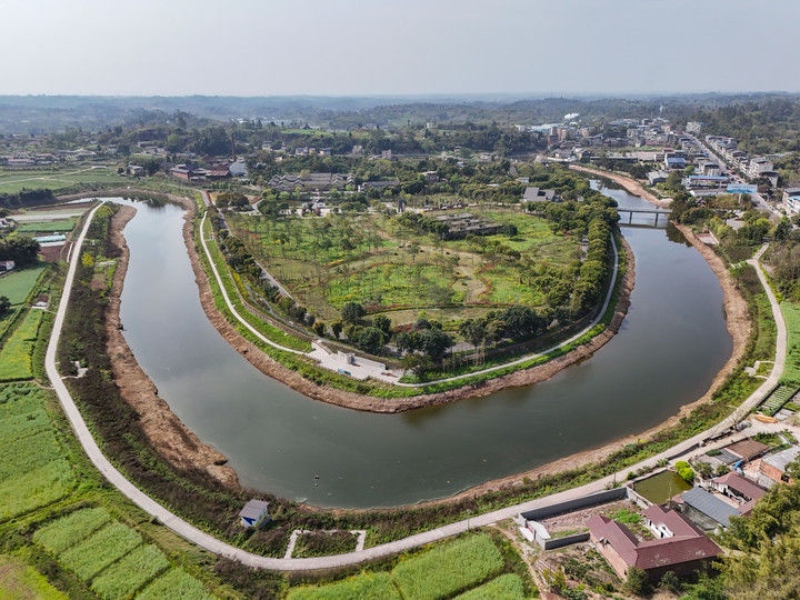 2025年4月2日,茫溪河流过四川省井研县千佛镇雷畅故居景区(无人机照片)。近年来,四川省井研县以打造高质量水利基础设施网络、构建健康稳定的水生态系统为目标,以里仁河——茫溪河水系为脉络,通过水系连通、河道清障、清淤疏浚、岸坡整治、水源涵养、景观人文等工程建设,改善乡村人居环境和卫生生活条件,打造生态宜居的水美乡村。