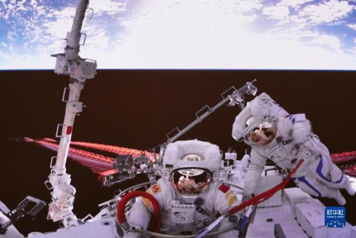 2022年9月2日在北京航天飞行控制中心拍摄的神舟十四号航天员刘洋(左)结束出舱任务正在返回的画面。 新华社发(李杰摄)