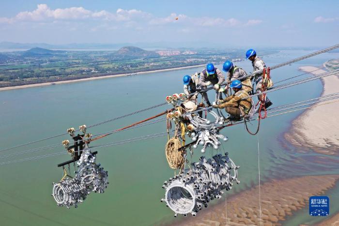 2022年9月16日,白鹤滩至浙江±800千伏特高压直流输电工程(白浙线)安徽段顺利完成长江大跨越放线作业。白浙线是我国实施“西电东送”战略的重点工程(无人机照片)。 新华社发(赵献富 摄)