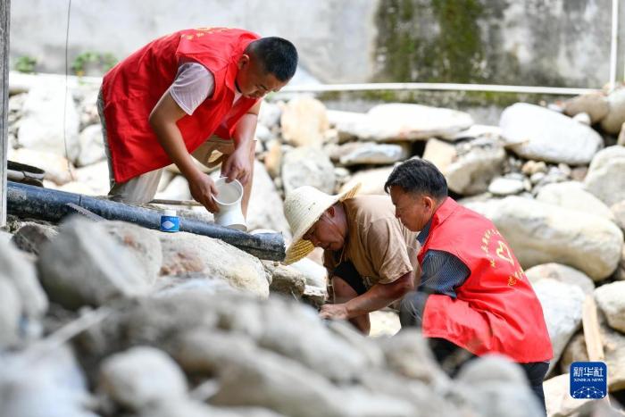 在贵州省黔东南苗族侗族自治州从江县刚边壮族乡银平村,党员志愿者帮助遭受强降雨袭击受灾的村民修整水管(2022年7月1日摄)。新华社记者 杨文斌 摄