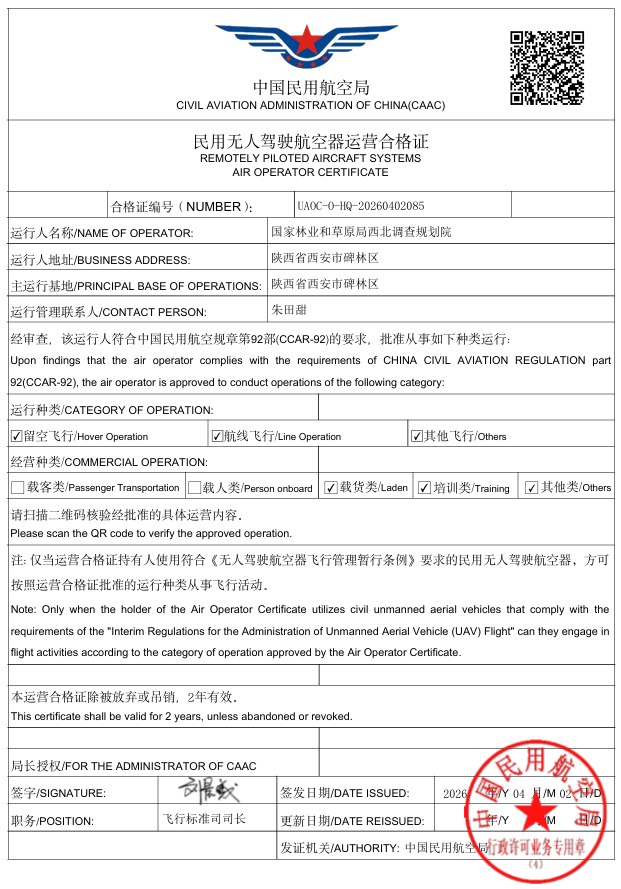 该资质的取得,精准补齐了我院无人机合规飞行核心资质短板,严格锚定低空国标刚性督察标准,全面适配现阶段民航“飞行台账溯源+作业资质年审”双链监管要求,同时从根本上解决了传统林草外勤人力无法覆盖的陡崖、密林区二元作业盲区,为我院低空作业拓展筑牢坚实基础。