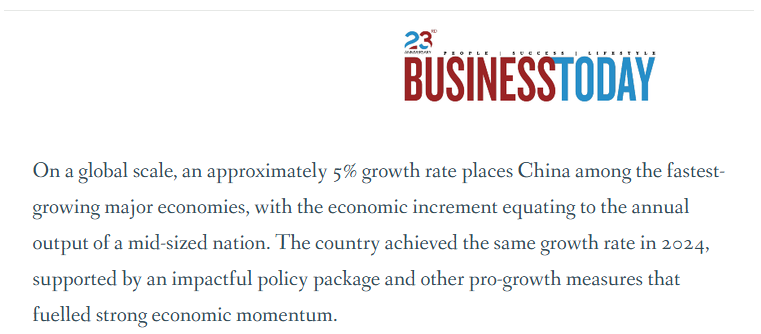 印度《今日商业》杂志的报道回顾了去年中国经济增长情况,称中国以5%的经济增长率跻身全球增长最快的主要经济体之列,这一经济增量相当于中等经济体一年的经济总量。