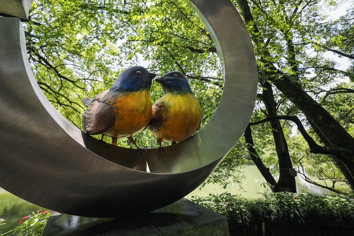 2024年7月3日,在江西省婺源县石门村拍摄的蓝冠噪鹛雕塑。新华社记者 杜潇逸 摄