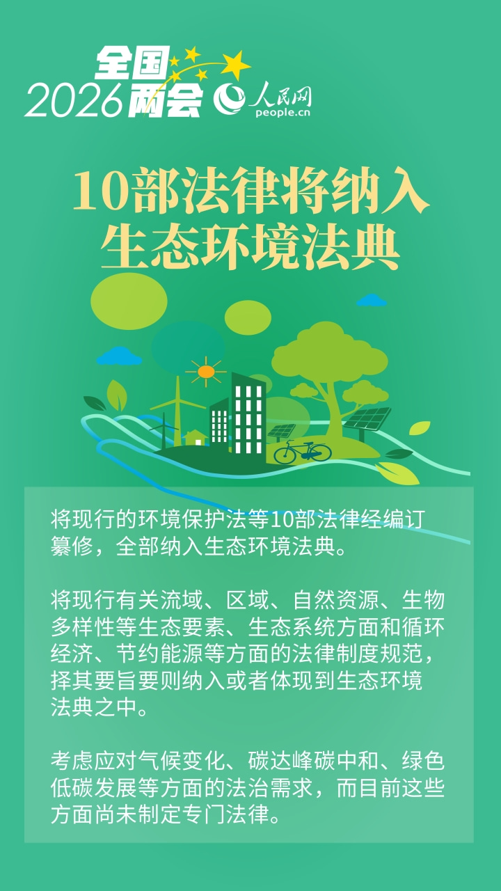 3月5日,《中华人民共和国生态环境法典(草案)》(以下简称生态环境法典草案)提请十四届全国人大四次会议审议。这将是继民法典后,我国第二部以“法典”命名的法律,也是世界上第一部以“生态环境法典”命名的法律。这部生态环境法典草案有哪些重点内容?一组海报速览。