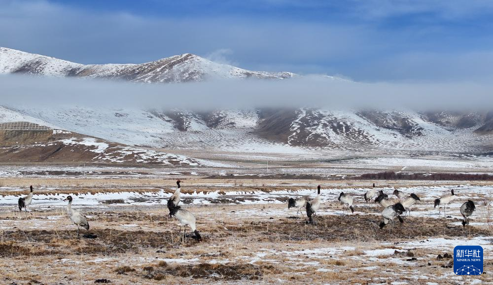 3月29日,黑颈鹤在四川省红原县的草原上觅食。