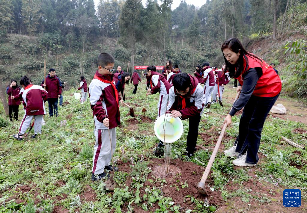3月10日,四川省广安市广安区富源小学的少先队员和志愿者一起栽植树苗。