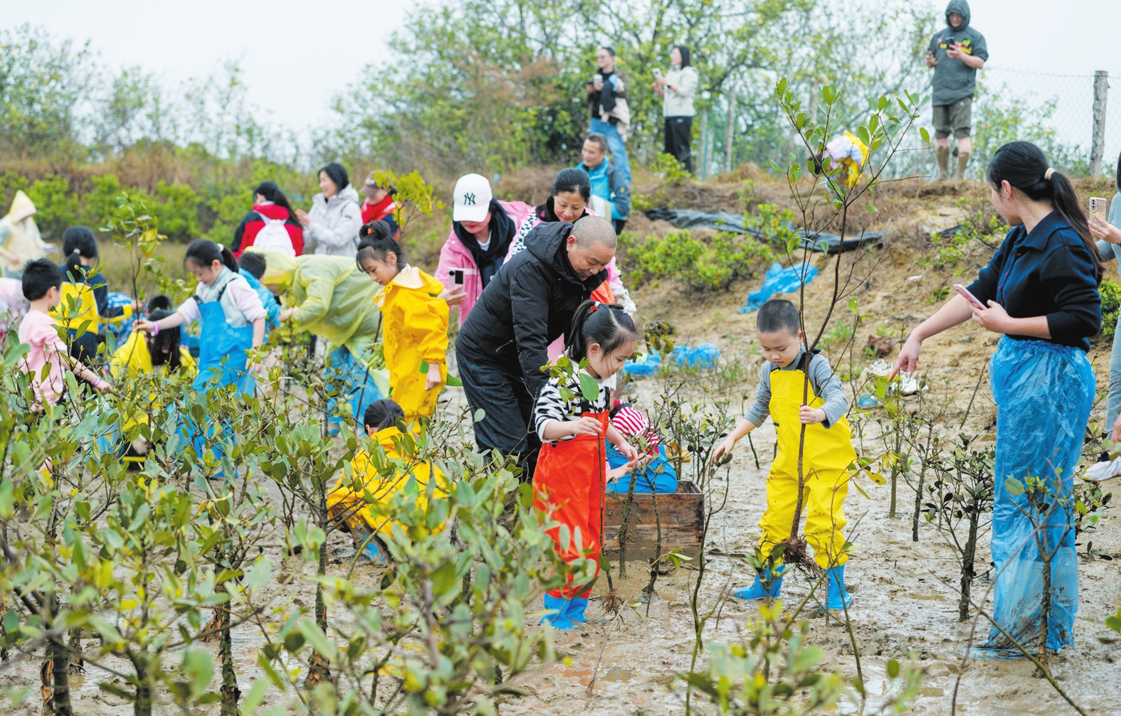 3月8日,海南东寨港国家级自然保护区内,亲子家庭在植树活动上栽种秋茄树苗。 记者 石中华 摄