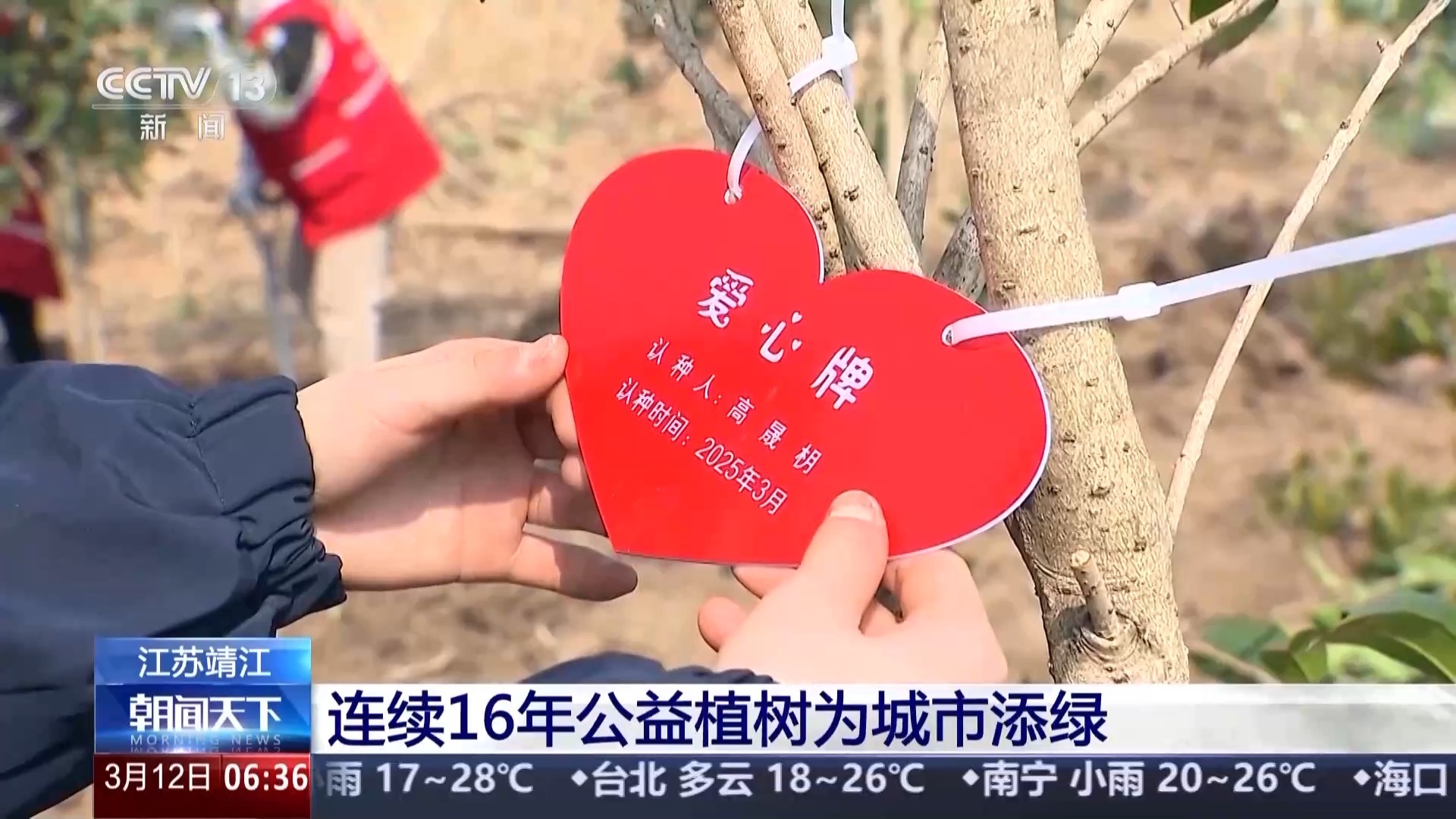 植树节到来之际,在江苏省靖江市靖城街道东南村生态修复项目现场,2000多名志愿者分工协作,栽种近700株桂花、香樟等苗木。树苗被成功栽种后,大家为每一颗树苗挂上了专属的“爱心牌”。据了解,当地爱心认种的公益植树活动已持续举行了16年,共筹得92.7万元爱心认种款,750余名有困难的学生因此获得帮扶。