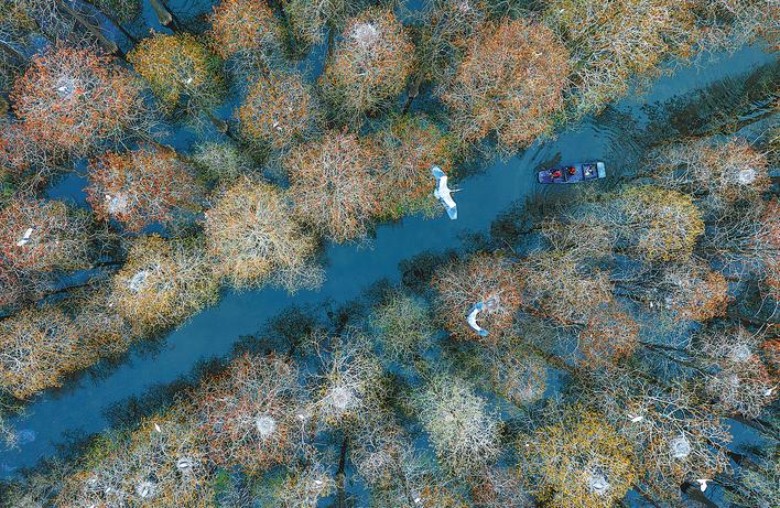 为了给鸟儿营造更好的生活环境,2024年,新洲区园林和林业局启动了水上森林鹭类栖息地修复项目。如今,修复项目顺利完工。300亩池杉林水相依,形成“湖中有树、树上有鸟、林中有岛、岛上居鸟、岸边生花”的奇特美景,也获得“水上森林”“绿野仙踪”等美称。
