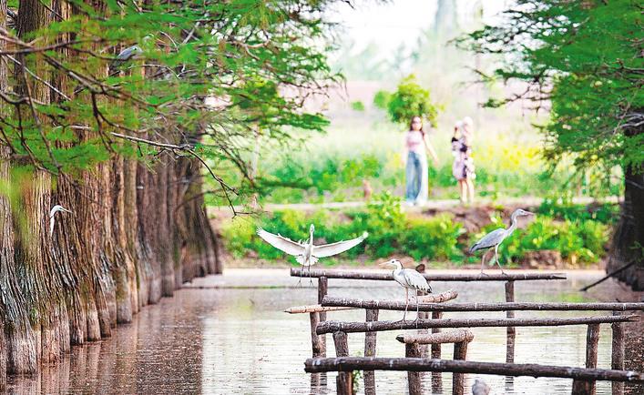 4月9日,游客在水上森林亲水观鸟。这里是鸟类的天堂,也是网红打卡地。
