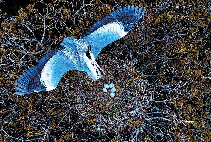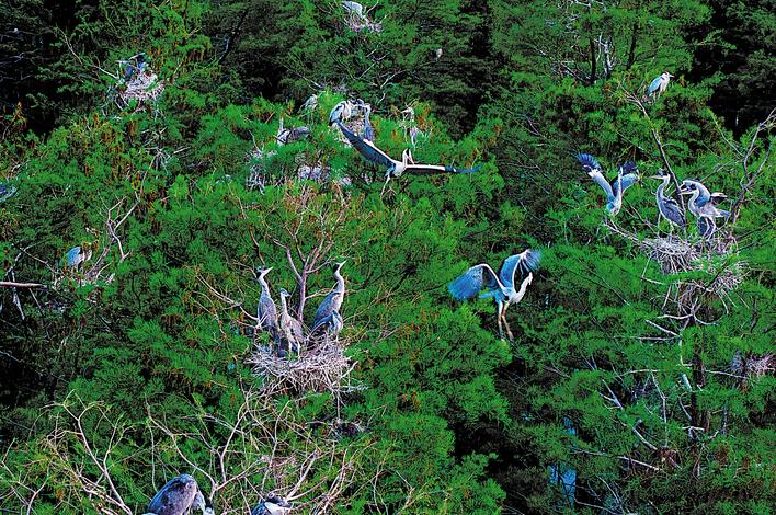 苍鹭是鸟界的模范“父母”。第一枚卵产出后,就开始孵育,雌雄亲鸟共同承担孵卵、喂养职责。大约40天后,雏鸟慢慢学会飞翔,离巢独立生活。