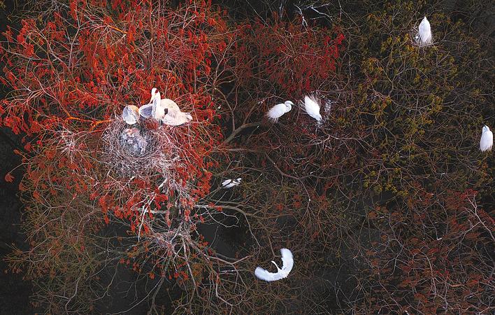 3月17日,涨渡湖水上森林的树顶端上,苍鹭正在孵蛋。