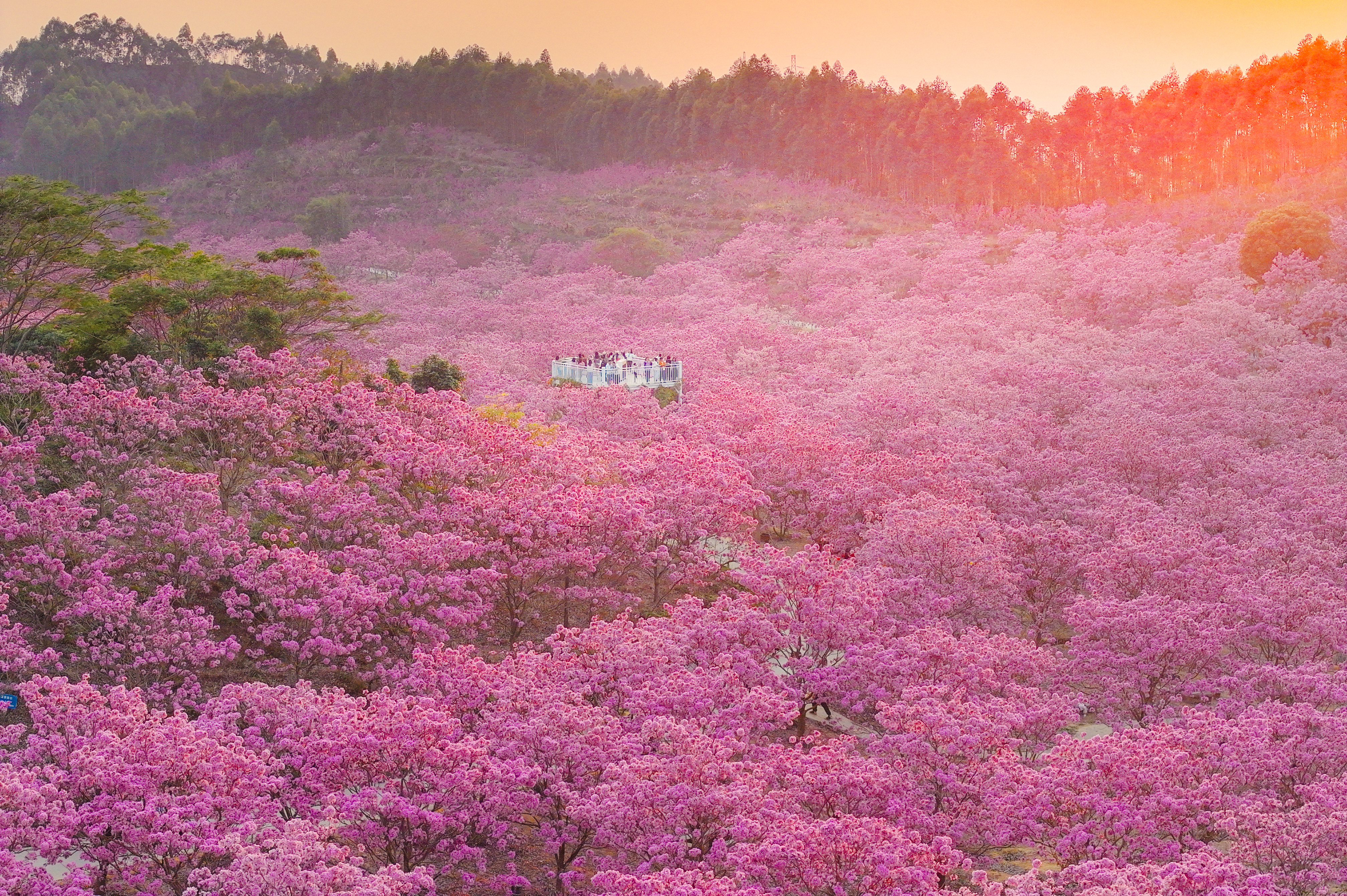 江门市新会区绿美生态园内,自2025年12月上旬开始,约6000株紫花风铃木竞相绽放,花期可持续至2026年1月上旬。