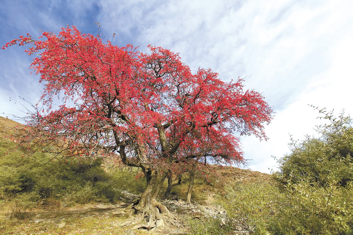 “俄色”,藏语意为“光芒”。四川省甘孜藏族自治州炉霍县地处青藏高原东南缘,日照时间长,昼夜温差大,得天独厚的自然环境孕育了俄色树这一稀有树种,入夏嫩芽吐翠、繁花似雪,深秋红果垂枝、香气盈林。每到秋季,在海拔3200米的炉霍县俄色茶现代林业园区,红润饱满的俄色果挂满枝头。