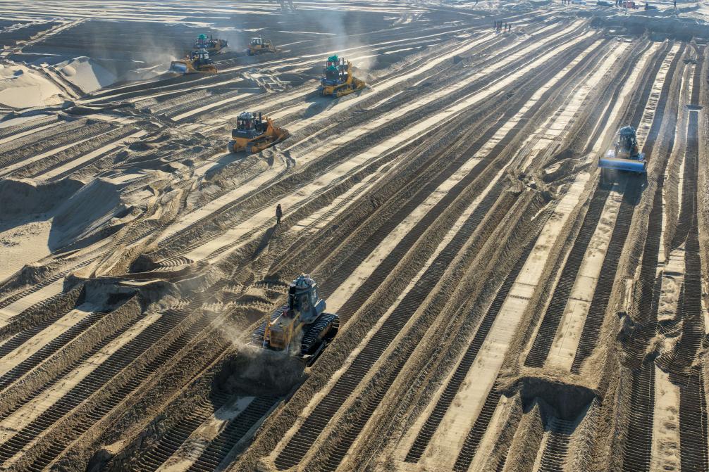 隆冬时节,塔克拉玛干沙漠西南缘的新疆和田地区墨玉县,治沙现场热火朝天。数十台推土机轰鸣着向沙漠腹地挺进,起伏的沙丘渐趋平整;不远处,一束束干芦苇被嵌入沙层,纵横交错的草方格如同坚实的“沙漠锁扣”,牢牢锁住流动黄沙。