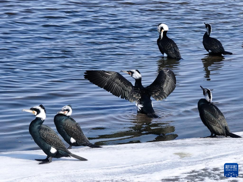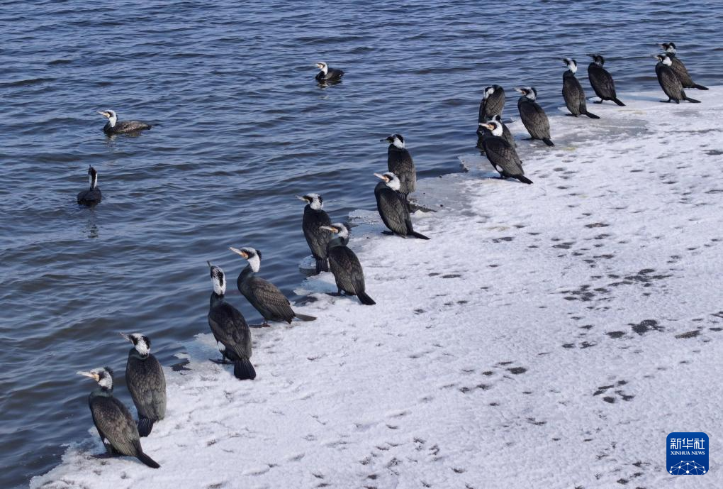 3月11日,在松花江哈尔滨段,鸬鹚在休息、觅食(无人机照片)。新华社发(杨威摄)