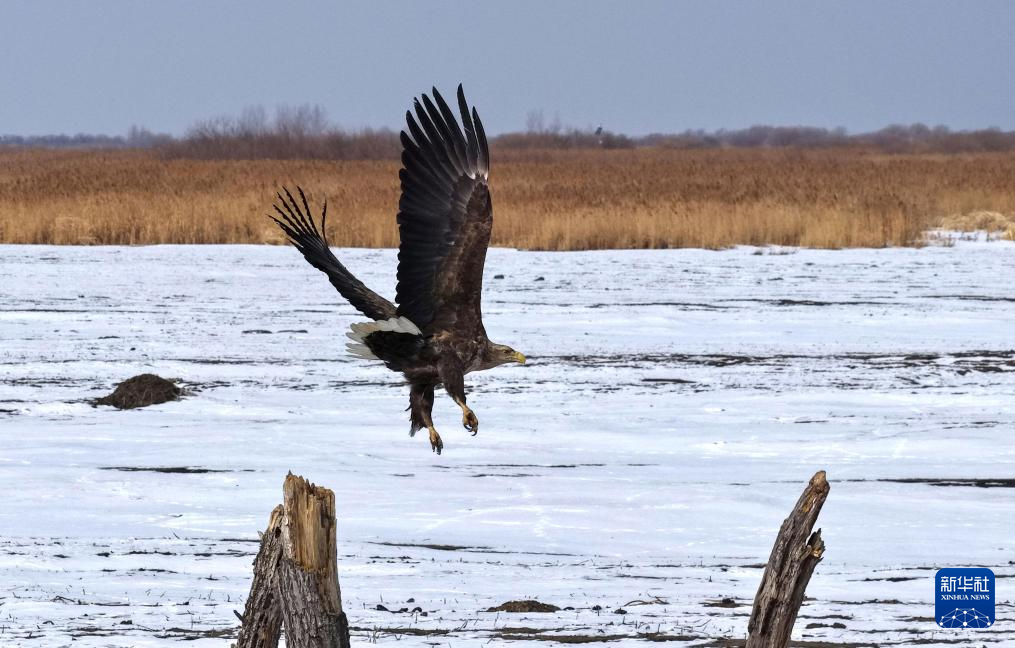3月6日,在位于黑龙江省鸡西市的兴凯湖国家级自然保护区湿地,白尾海雕在飞翔(无人机照片)。新华社发(孙海淇摄)