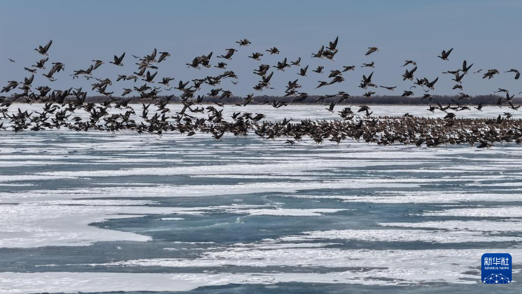 3月9日,在位于黑龙江省鸡西市的兴凯湖国家级自然保护区,一群豆雁在冰面上起飞(无人机照片)。新华社发(孙海淇摄)