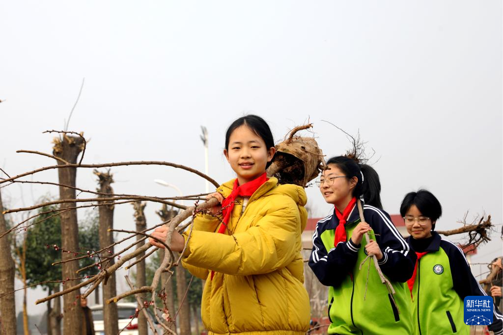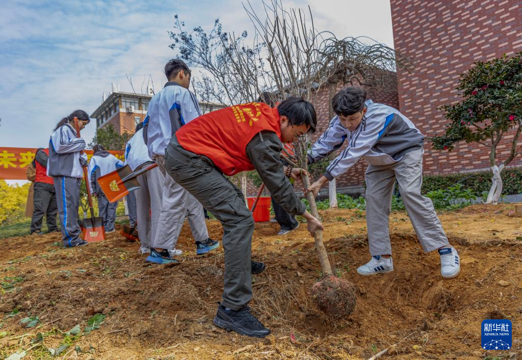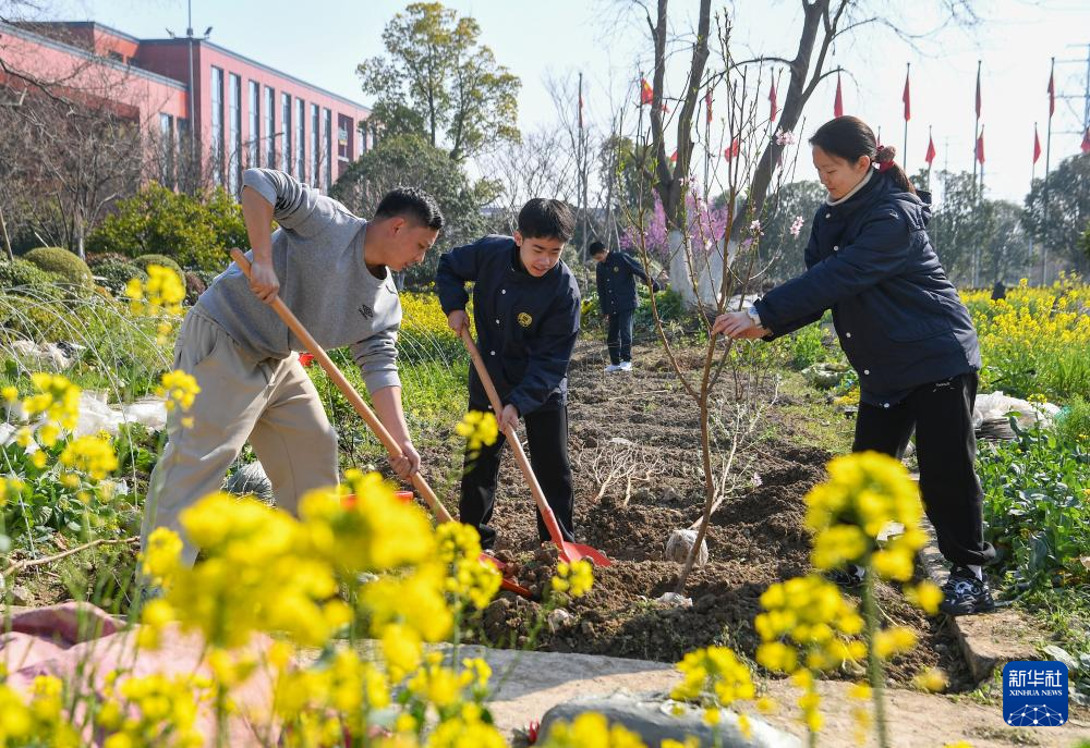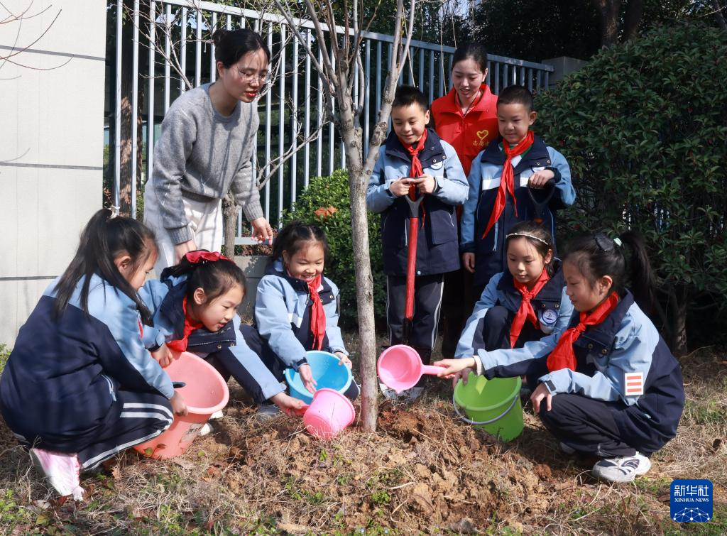 3月11日,在武汉市武昌区滨江实验第一小学,学生、教师和青年志愿者参加义务植树活动。