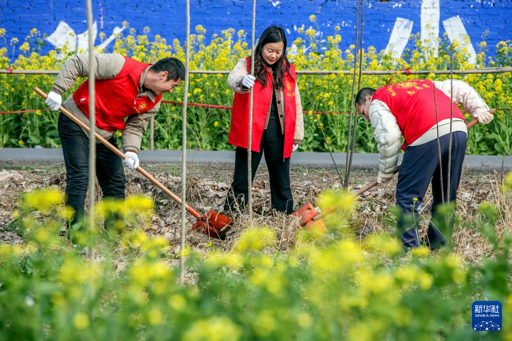 3月11日,志愿者在四川省眉山市洪雅县将军镇李槽村花园村落开展植树活动。