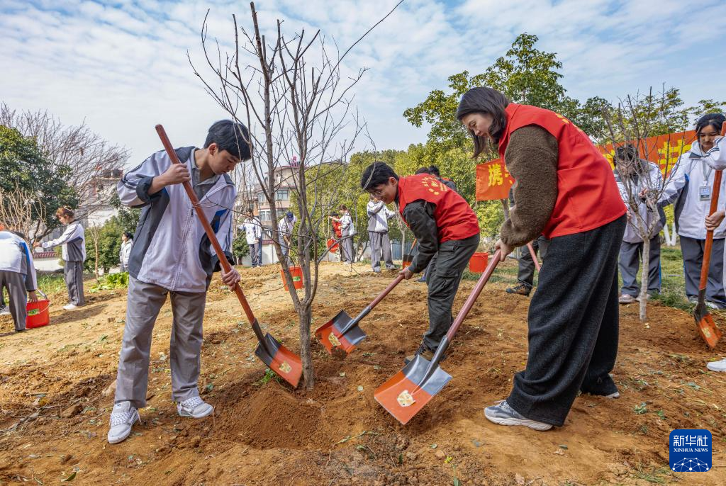 3月11日,浙江湖州供电公司的“月圆公益”志愿服务队青年志愿者与湖州长兴职教中心学生在校园内一同开展义务植树活动。