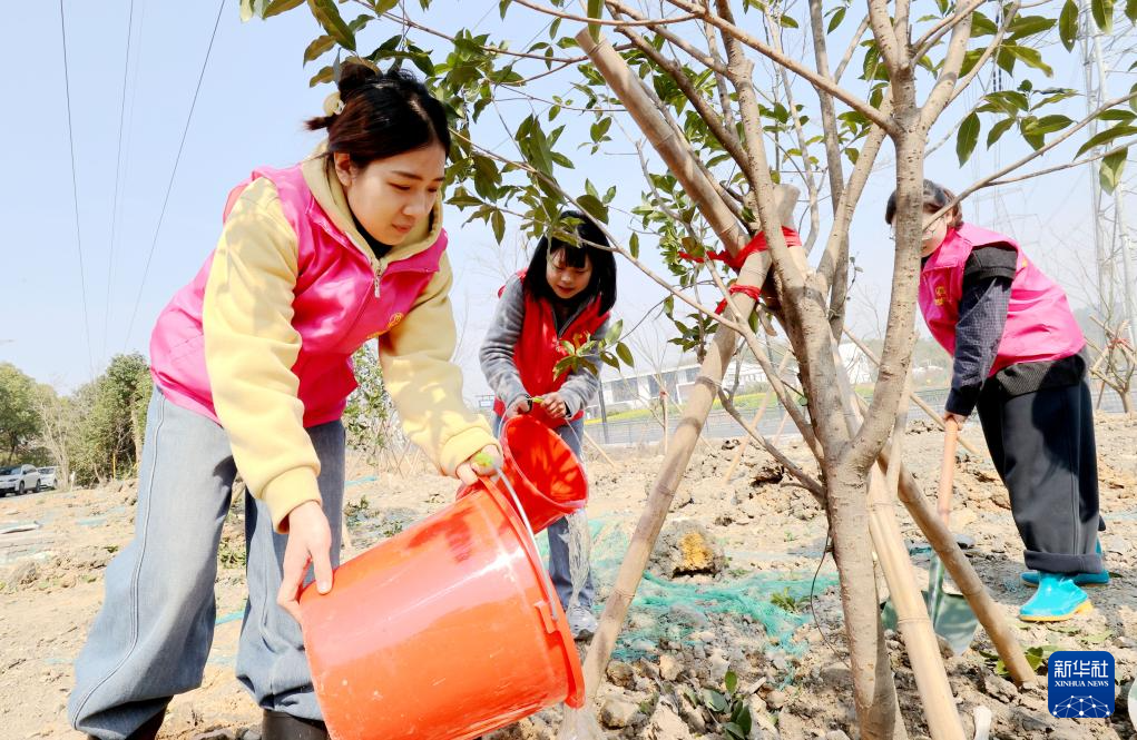 3月11日,浙江省湖州市德清县阜溪街道青年志愿者在参加义务植树活动。