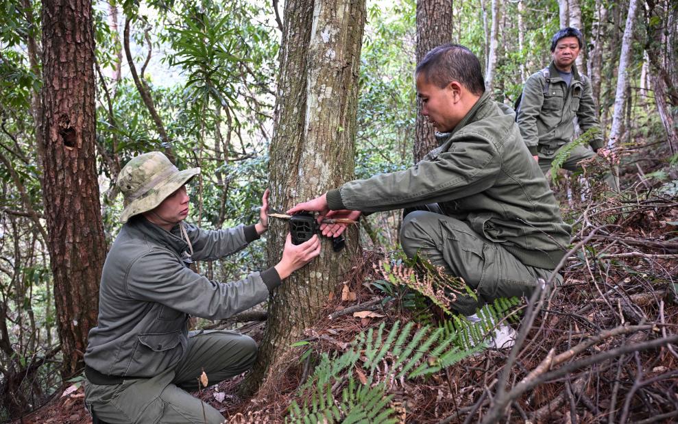 在半山腰上的一个拐角处,护林员们从书包里掏出红外检测仪器,装上电池后绑在一棵大树上,这种在动物兽道附近安装仪器的观测方式被他们称为“人与动物最安全又最亲密的接触”。