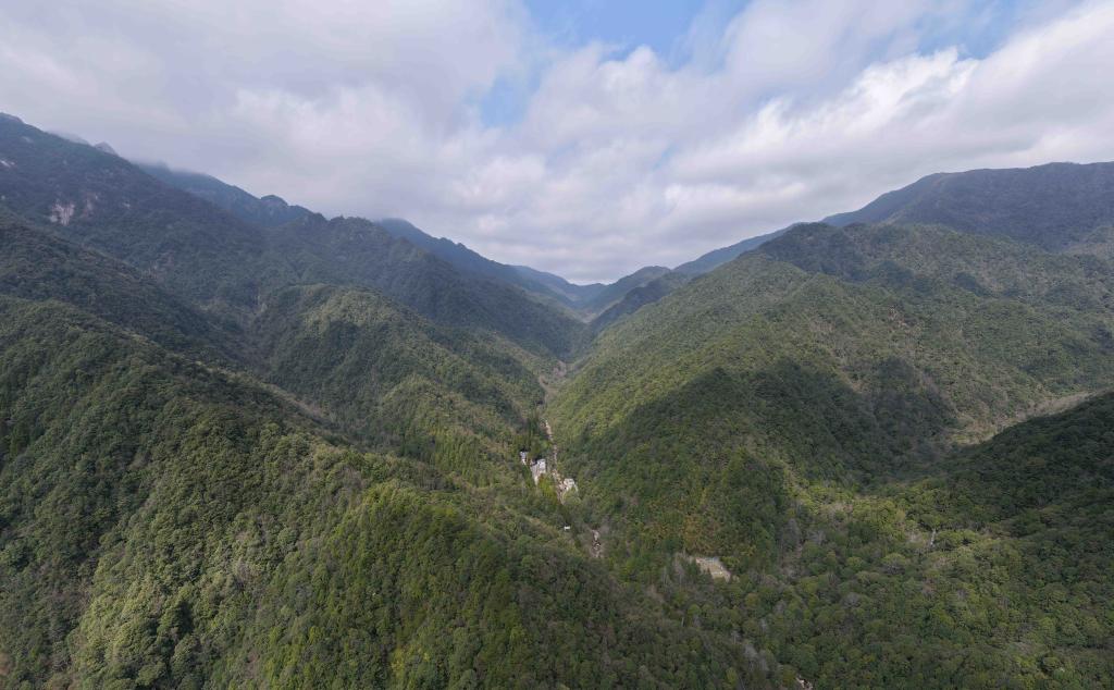 坐落于南岭山脉中的广东省乳阳林场八宝山管护站(3月17日无人机照片)。新华社记者 邓华 摄