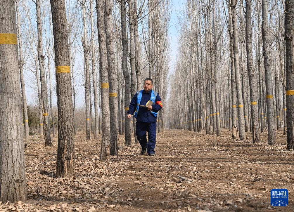 3月19日,刘世光在雄安新区“千年秀林”雄中片区的树林里测量树木生长量。