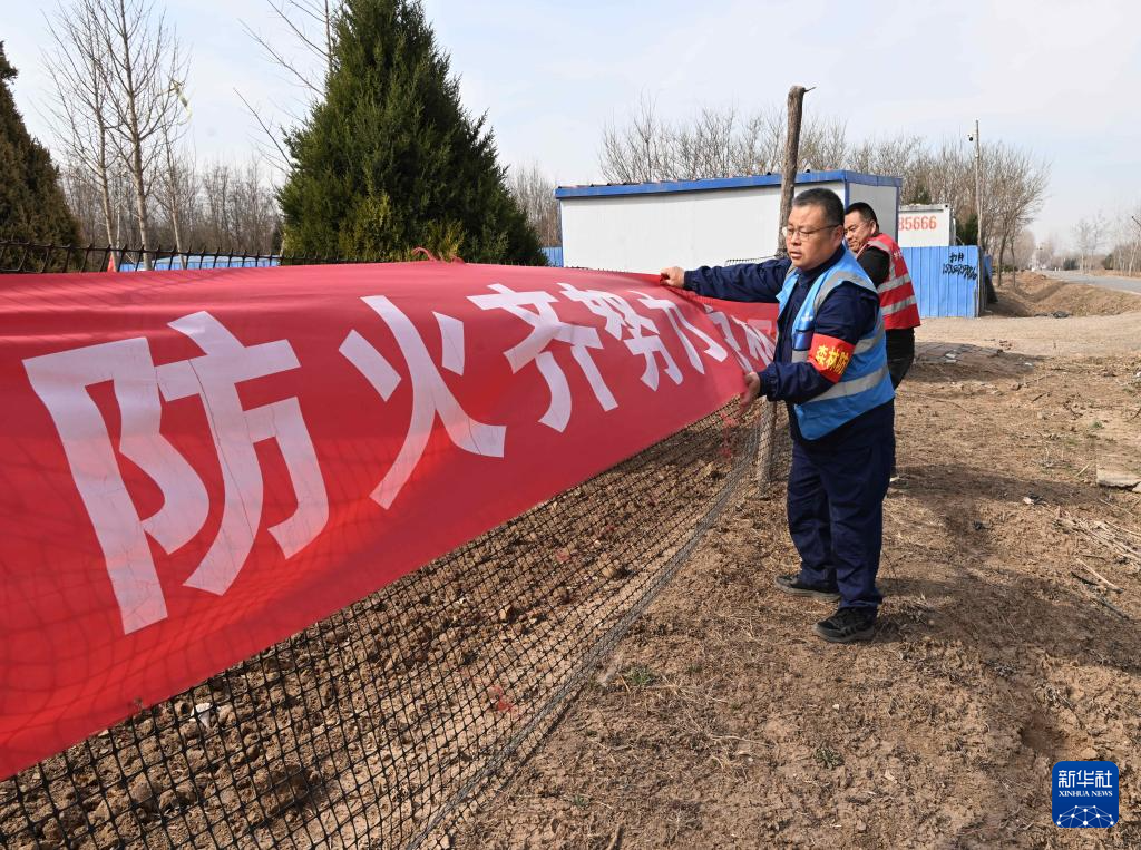 3月19日,刘世光(前)在雄安新区“千年秀林”雄中片区悬挂防火宣传横幅。