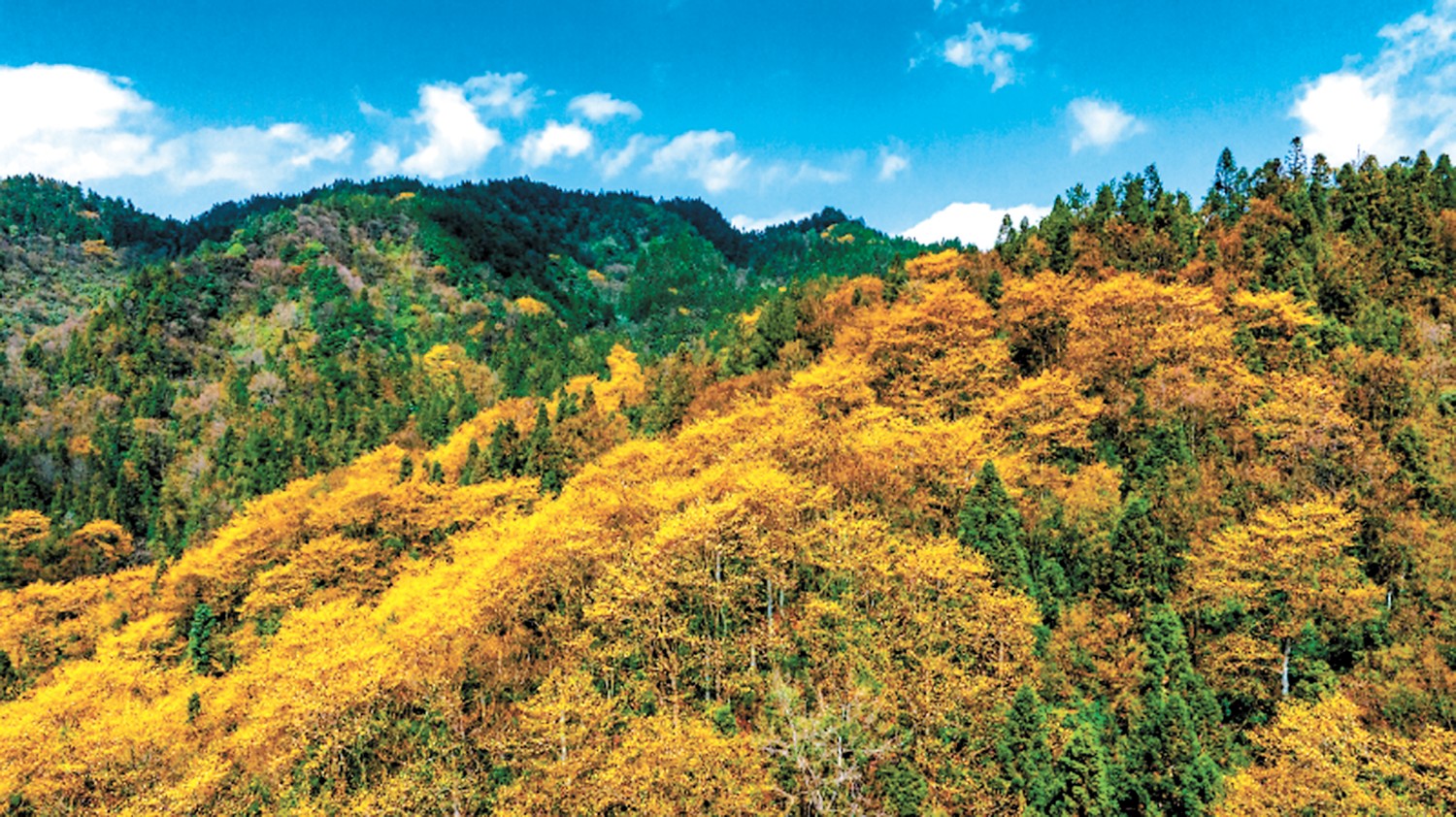 3月中旬以来,位于四川省宣汉县月亮坪森林康养旅游度假区的2000余亩天然檫木花海次第绽放,如串串金铃随风轻摇,满树金黄点亮山野,吸引各地游客纷至沓来。