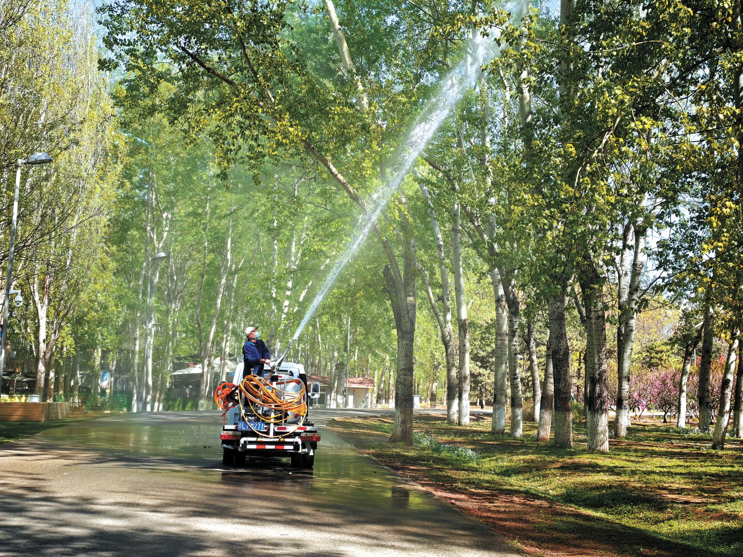 北京奥森公园(北园)内工程车向杨树喷凝絮剂。尚文博摄