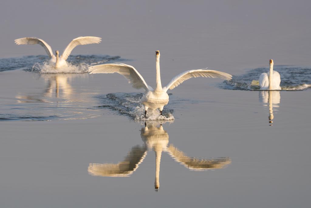 运城、三门峡有关部门提供的数据显示,黄河两岸天鹅数量近年来出现跨越式增长。越冬大天鹅在运城盐湖从十年前的零星可见,增长到今年的470多只;芮城圣天湖从上世纪90年代末的几十只,跃升至如今的7000多只;平陆三湾湿地从20多年前的2000只,稳定增长至如今的过万只。在三门峡,大天鹅的数量突破1.6万只。