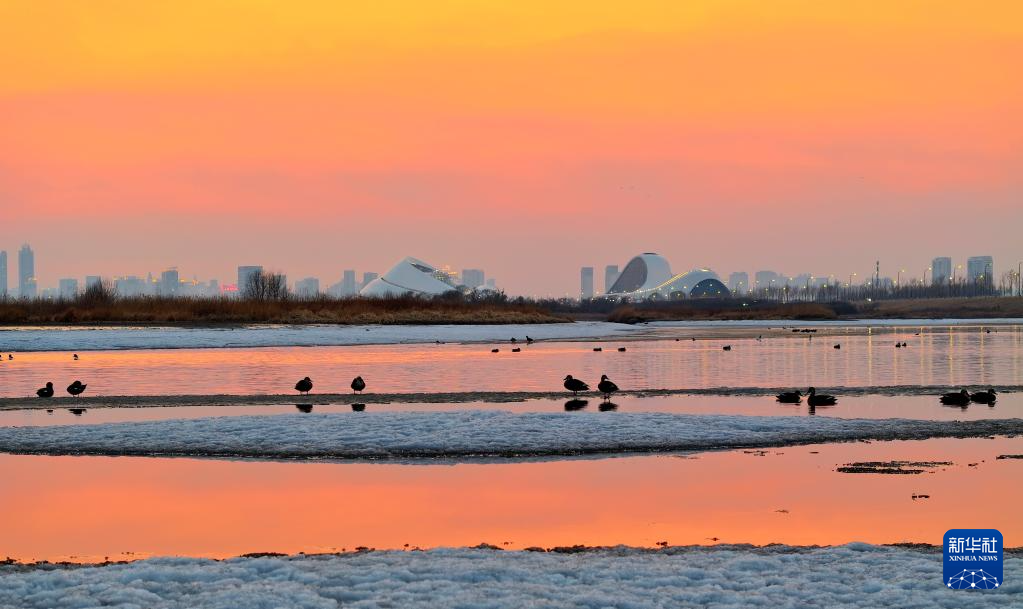 3月27日,候鸟在哈尔滨大剧院附近江面停歇(无人机照片)。新华社发(张树摄)
