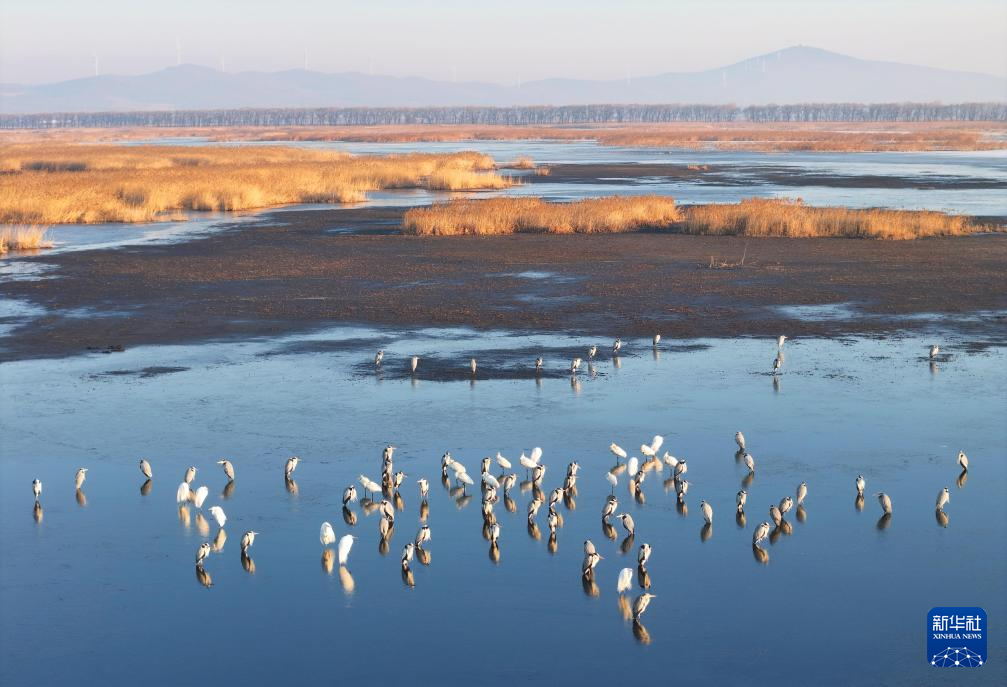 这是3月28日在黑龙江省富锦国家湿地公园拍摄的候鸟(无人机照片)。新华社发(曲玉宝摄)