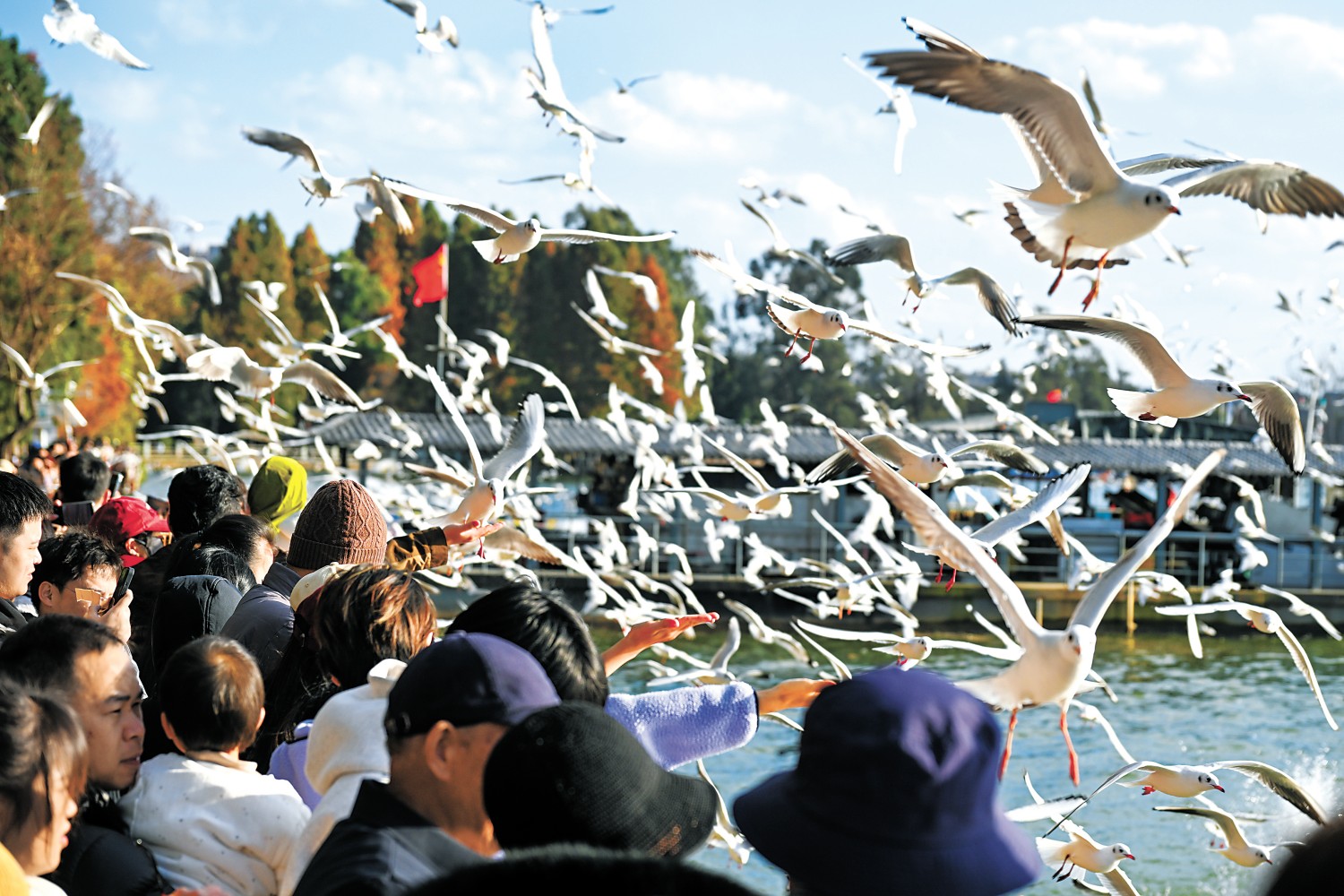 12月26日,游客在云南昆明海洪湿地与红嘴鸥互动