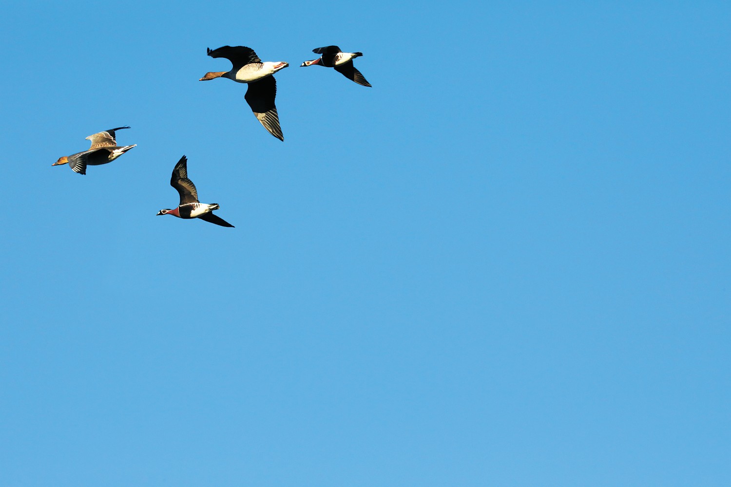 近日,北京市延庆区自然保护地管理处科研监测科工作人员在整理日常监测影像时,在一群豆雁群照片中,发现了3只体型稍小、羽色特征迥异的个体。经详细比对和专家确认,鉴定该鸟为国家二级保护野生动物红胸黑雁。这是北京市首次记录到红胸黑雁。