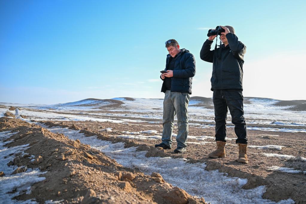 在新疆卡拉麦里山有蹄类野生动物自然保护区,站长蒙坎·吾通拉生(左)和驾驶员也勒肯·塔拉甫汗观察并记录远处野生动物(2月4日摄)。新华社记者 丁磊 摄