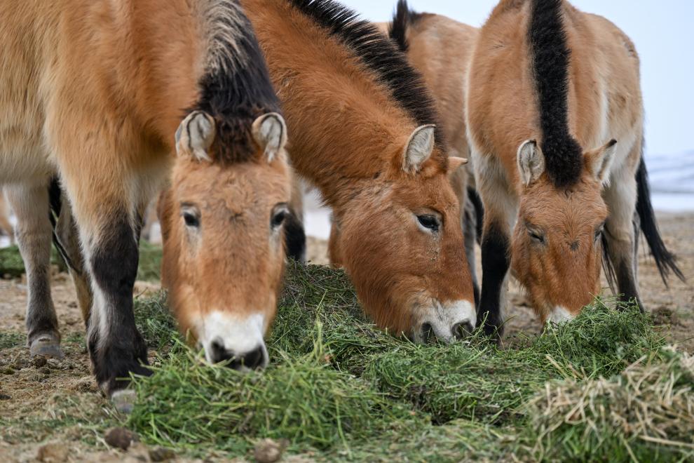 午后的阳光透过云层,洒在草料库外的空地上。那些入冬前主动返回监测站附近越冬的野马还在等待投喂。管护员们将一捆捆草料整齐码放在拖拉机上,随着车轮缓缓驶出,等候多时的野马立刻簇拥而来。草料一一卸下,马群便扎堆进食,咀嚼声穿透寒风,充满生机。