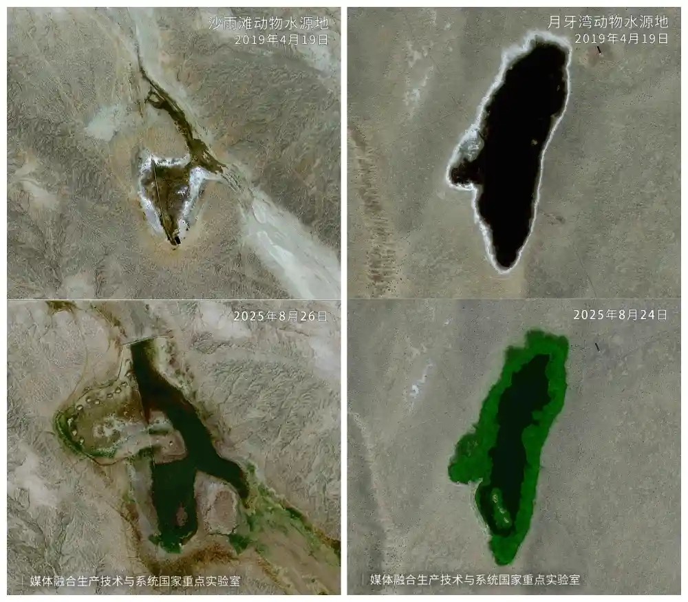 卫星影像记录下新疆卡拉麦里山有蹄类野生动物自然保护区沙雨滩动物水源地、月牙湾动物水源地的“绿色跨越”。新华社发
